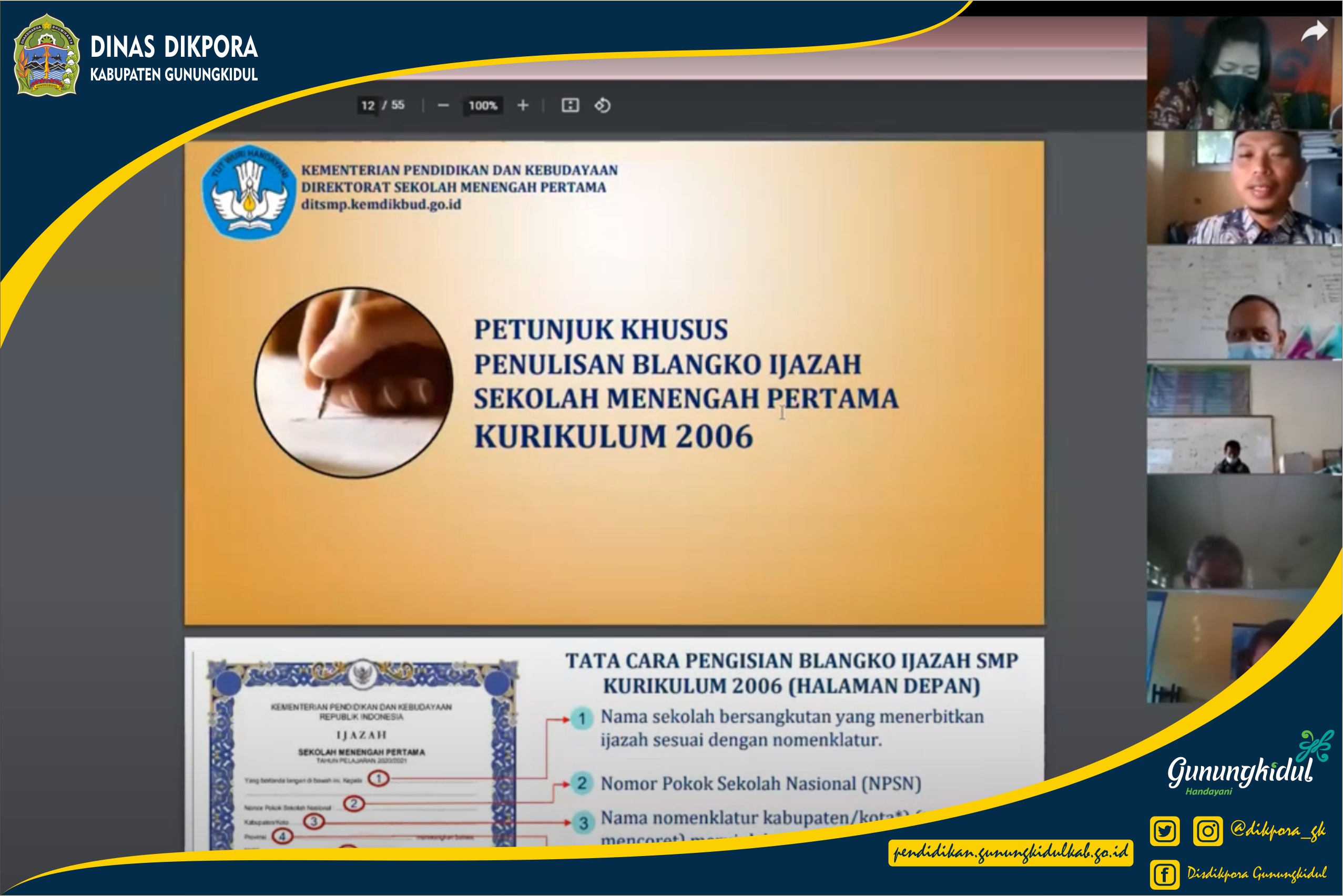 WONOSARI- Dinas Pendidikan, Pemuda, dan Olahraga (Disdikpora) Kabupaten Gunungkidul menyelenggarakan kegiatan Sosialisasi Penulisan Blanko Ijazah SMP Tahun Pelajaran 2020/2021